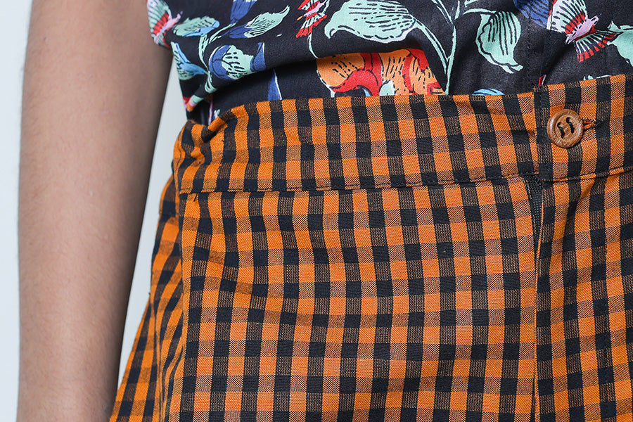 Checks shorts in Orange and black. Soft, pure cotton fabric. Pockets along the seam.